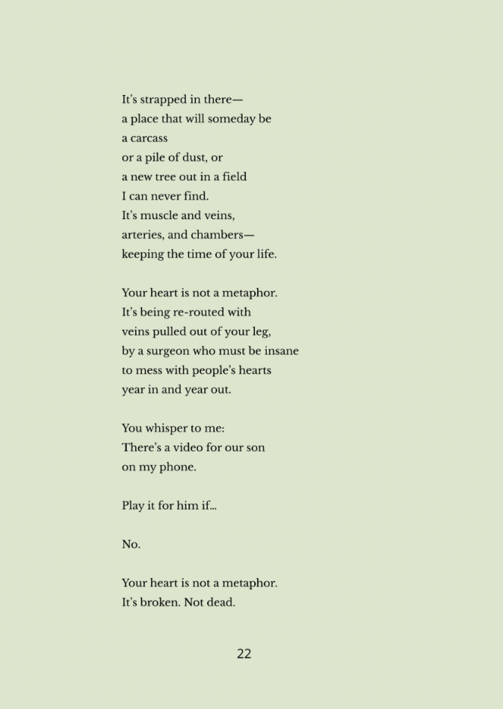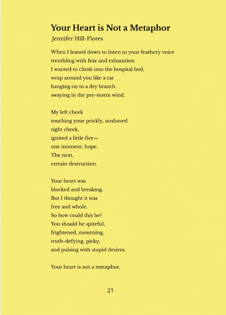 Thanks to Beyond Words Literary Magazine for publishing “Your Heart is Not a Metaphor” in their March 2024 issue. I’ve put a hold on submitting to publications for a few months due to a novel I’m working on. In the meantime, I hope this resonates with anyone experiencing a harrowing trip to the hospital with a loved one.